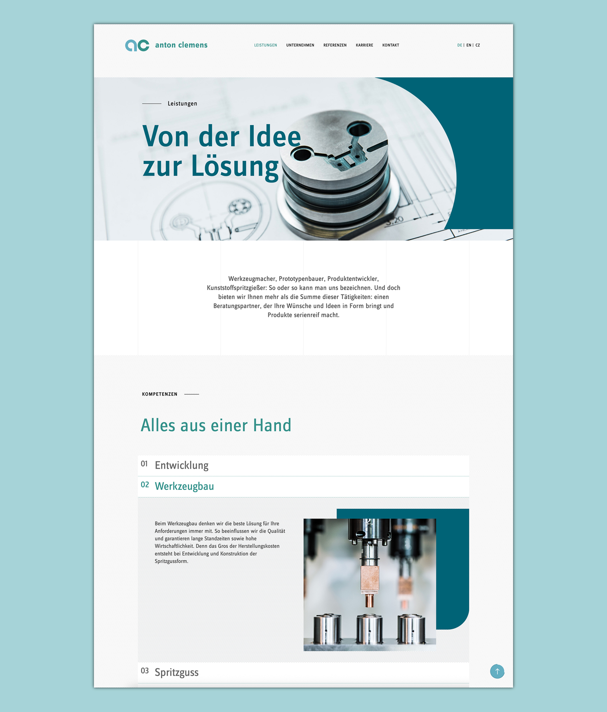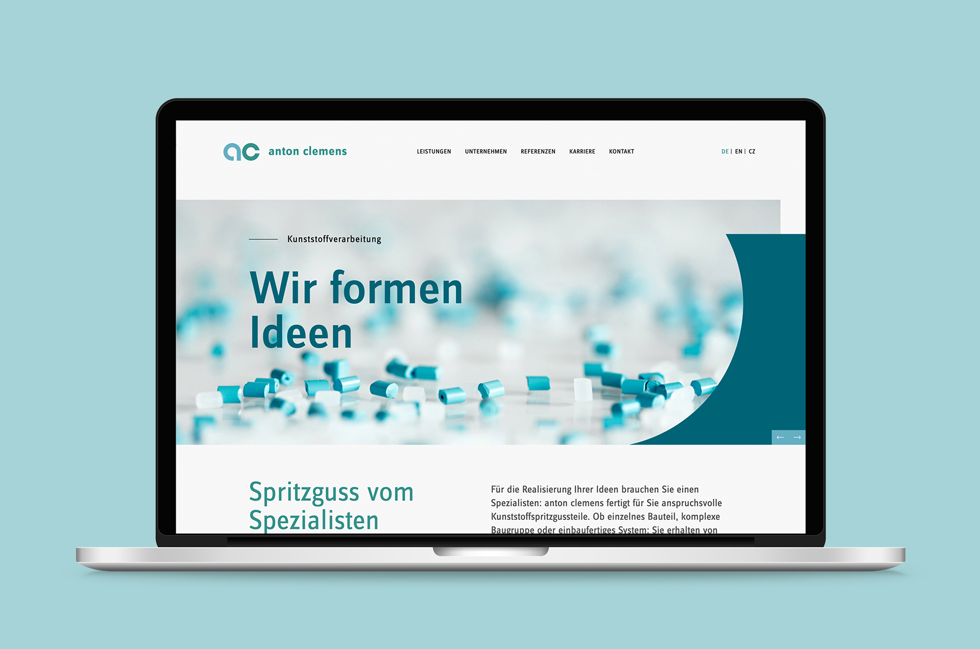 anton clemens ist Spezialist für technisch anspruchsvolle Kunststoffspritzgussteile. Das Familienunternehmen in dritter Generation ist international tätig und produziert an zwei Standorten in Deutschland und Tschechien. Bereits vor zehn Jahren gestalteten wir die Website für das Unternehmen – nun durften wir den digitalen Auftritt neu konzipieren. Unser zeitgemäßer Ansatz: ein großzügiges Design, das mit der charakteristischen Formensprache des Unternehmens arbeitet. Kreisformen aus dem Logo – unterschiedlich variiert – spielen mit der Assoziation zu Spritzgussformen und machen die Website unverwechselbar. Während großformatige Fotos authentische Einblicke ins Unternehmen geben, gliedern dezente Linien im Hintergrund die Inhalte und setzen technische Akzente. Klare, kurze Einstiegspunkte und gezielte Querverweise führen Besuchende intuitiv durch das gesamte Angebot – in drei Sprachen. > anton-clemens.de